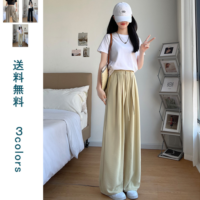 ワイドパンツ レディース ボトムス パンツ 美脚パンツ ゆるパンツ イージーパンツ 夏 ロング丈 ウエストゴム 楽ちん 体型カバー カジュアル 通勤 通学 涼しい 涼感 ヒンヤリ カット なめらか