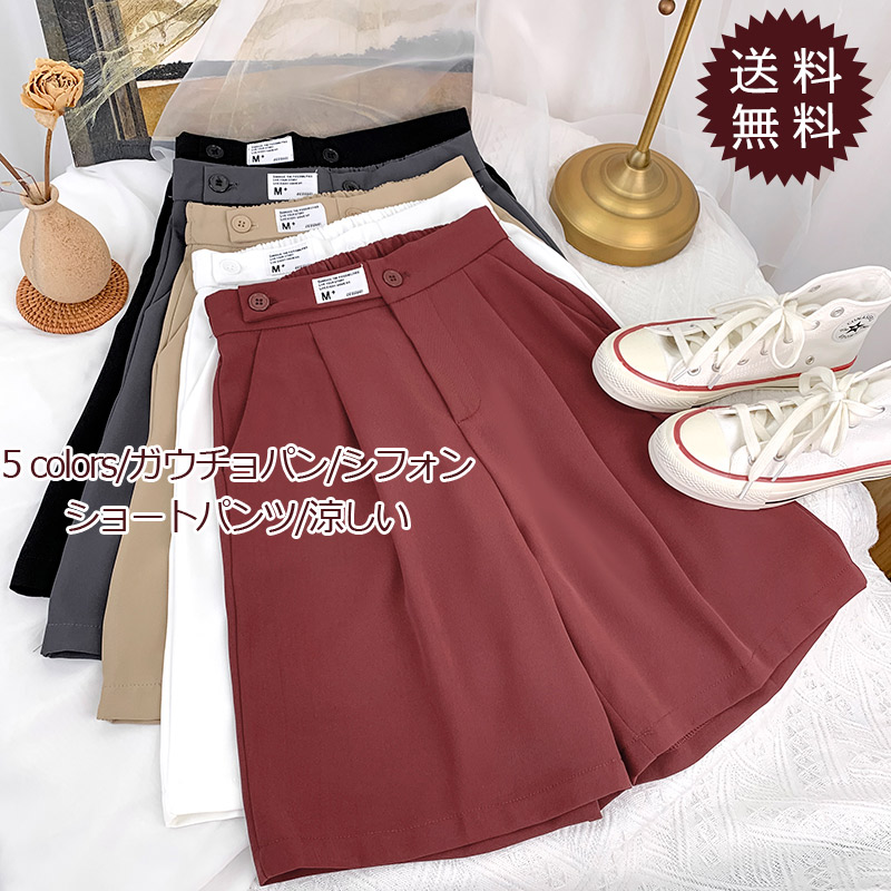 ガウチョパンツ レディース 五分丈 無地 シフォン ショートパンツ ポケット付き ハイウエスト 夏用 ゆったり ボトムス きれいめ おしゃれ