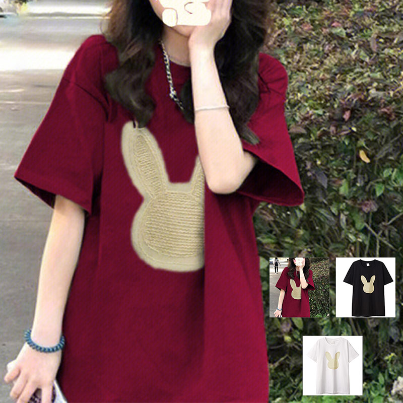 Tシャツ レディース 夏 トップス うさぎ柄 Tシャツ ロング丈 可愛い カジュアル カットソー クルーネック 半袖 夏物