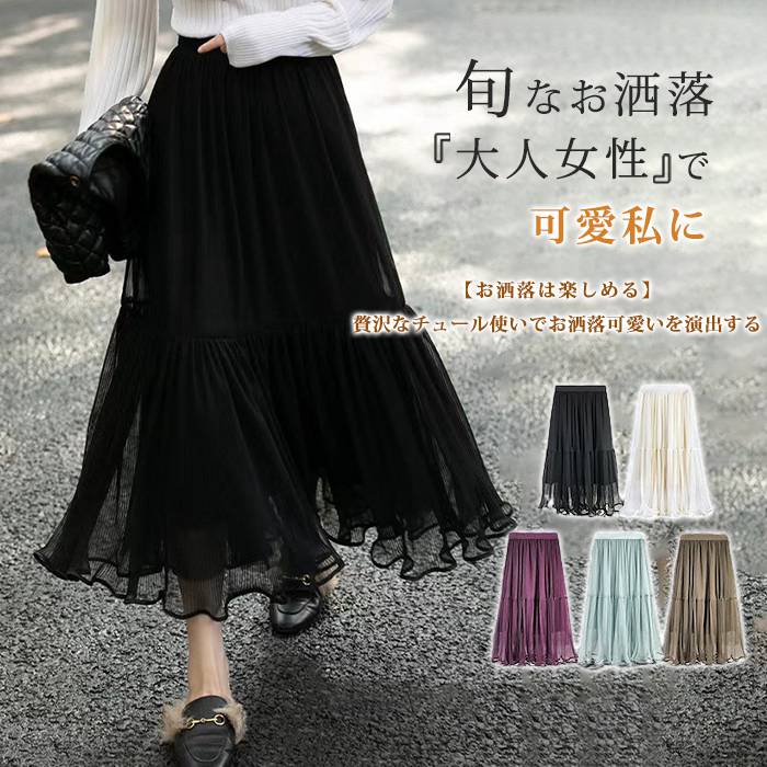 スカート お花見 桜 さくら チュールスカート レディース 夏 春 ロングスカート フレアスカート マキシ ウエストゴム フリル ボリューム ファッション ゆったり