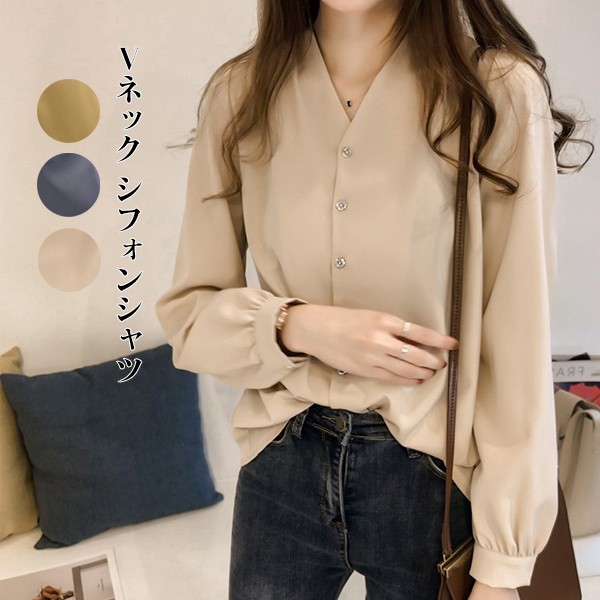 シャツ レディース ブラウス オフィス 長袖シャツ シフォン ノーカラー vネック ゆる感 ブラウス レディース トップス カジュアル