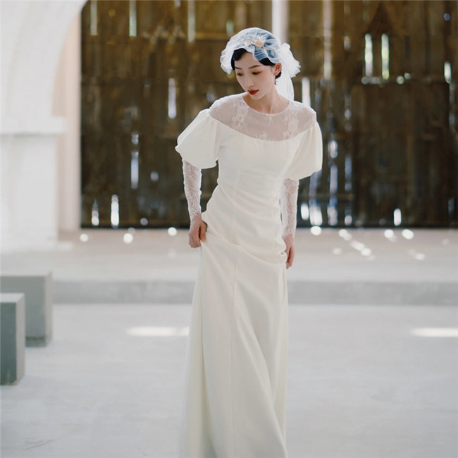 ウェディングドレスライン 七分袖 ロングドレス ウェディングドレス レース 編み上げタイプ~ お花嫁結婚式撮影演出レディースウェディングドレス床付きオーダーメイド可能