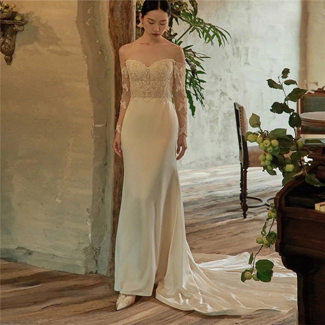 ホワイト オフショルダー ウェディングドレスラインファスナータイプトレーン レース 素地 ~ お花嫁結婚式旅行撮影演出レディースウェディングドレス