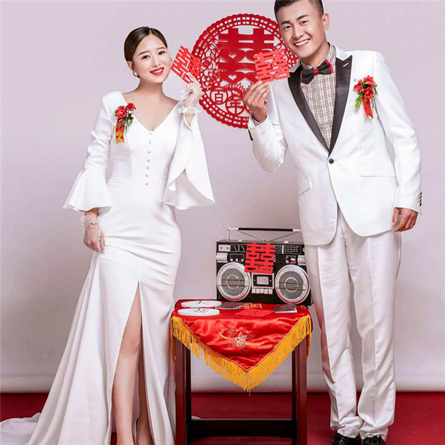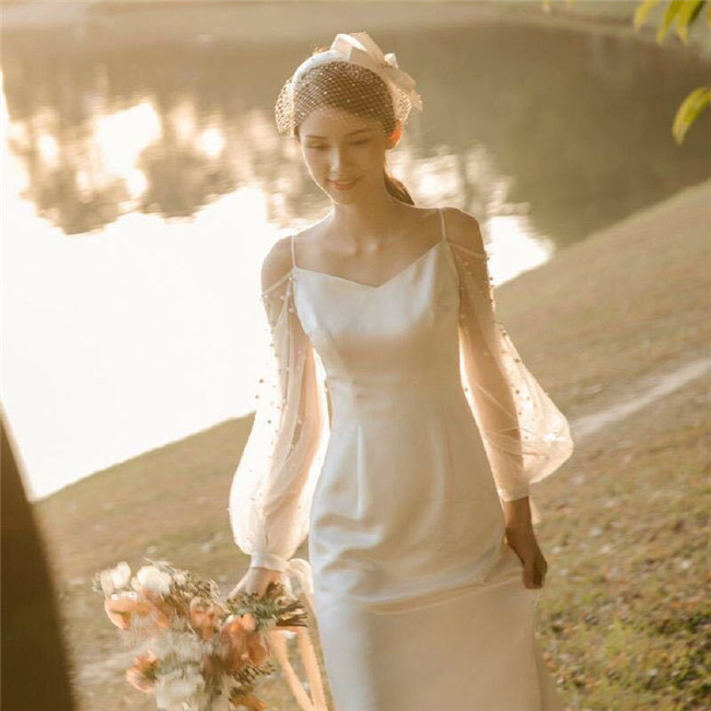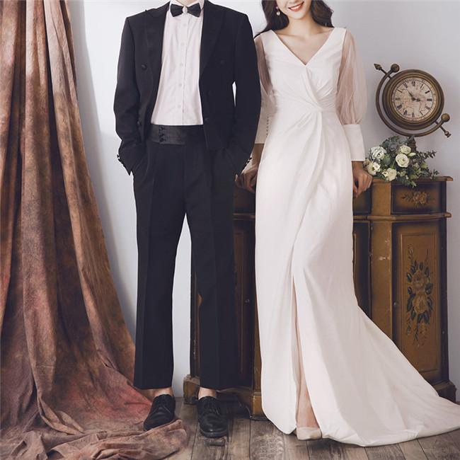 ホワイト 長袖袖あり二次会ドレス パーティードレス トレーン 二次会演出司会 結婚式お呼ばれレディースファッション ドレス