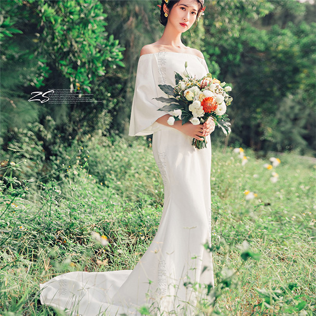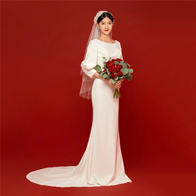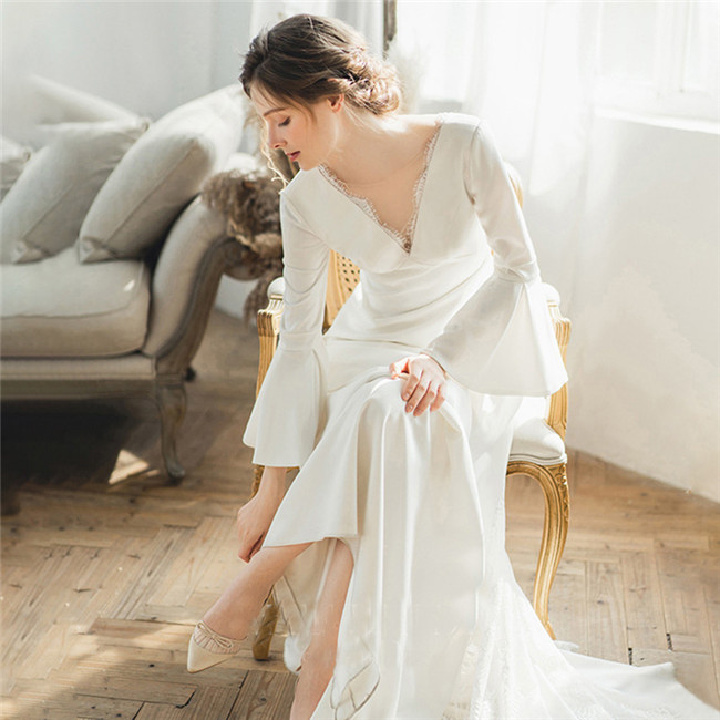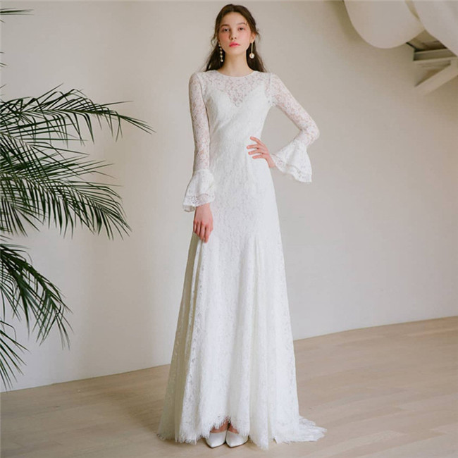 ホワイト 長袖袖あり ウェディングドレスラインファスナータイプトレーン レース 素地 ~ お花嫁結婚式旅行撮影演出レディースウェディングドレス
