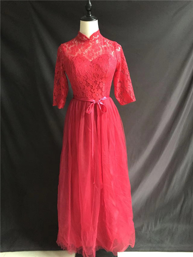 ワインレッド 七分袖袖あり マキシ丈、ロング丈ロングドレススカート レディースドレスパーティードレス