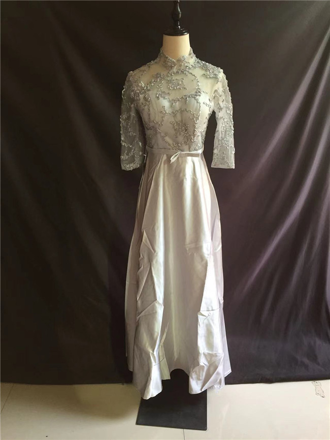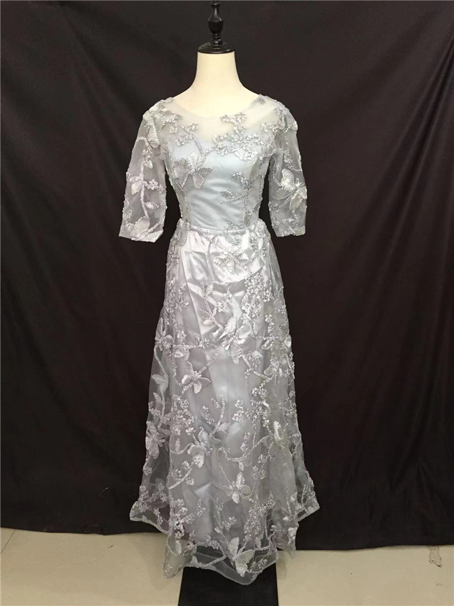 ライトグレー 七分袖袖あり マキシ丈、ロング丈ロングドレススカート レディースドレスパーティードレス