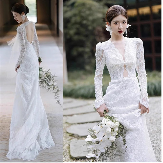 総レースホワイト ウェディングドレスマーメイド長袖 ロングドレス ウェディングドレス レース ファスナータイプ~ お花嫁結婚式撮影演出レディースウェディングドレストレー
