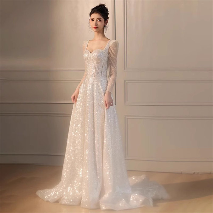 ホワイトロング ウェディングドレス 長袖レース花嫁 結婚式 披露宴 フォマール ドレス シンプル ライン ウエディング ドレス チュール 可愛い ブライド ドレス 発表会 演奏会 ドレス 前撮り リ