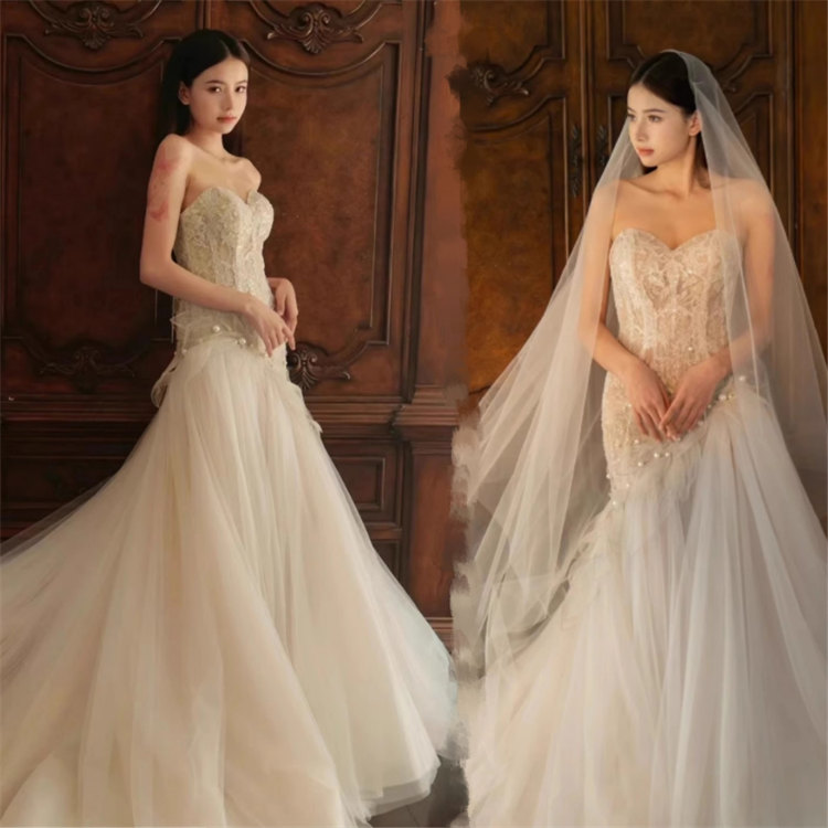 ロング ウェディングドレス ビスチェ総レース花嫁 結婚式 披露宴 フォマール ドレス シンプル マーメイド ウエディング ドレス チュール 可愛い ブライド ドレス 発表会 演奏会 ドレス 前撮り リ