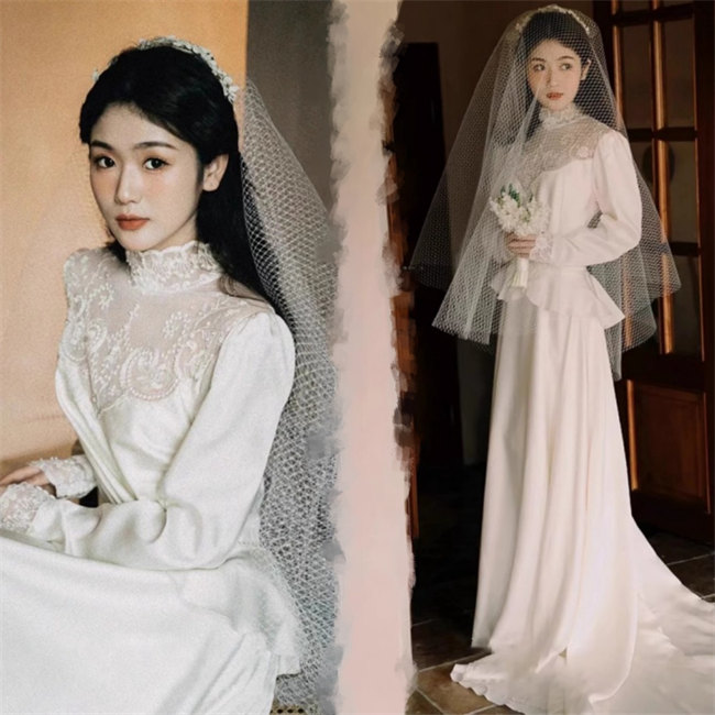 ホワイトロング ウェディングドレス 長袖総レース花嫁 結婚式 披露宴 フォマール ドレス シンプル ライン ウエディング ドレス チュール 可愛い ブライド ドレス 発表会 演奏会 ドレス 前撮り