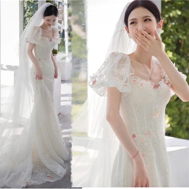 ロング ウェディングドレス 半袖花嫁 結婚式 披露宴 フォマール ドレス シンプル マーメイドトレーン ウエディング ドレス チュール 可愛い ブライド ドレス 発表会 演奏会 ドレス 前撮り リボン