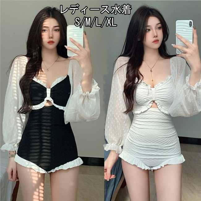 黒 白パッド付き 水着 体型カバー ワンピース 黒 ブラック レディース 長袖一体式かわいい通販 おしゃれ レディース水着 20代 30代 40代 50代パンツ付き体型カバーレディース水着カップ付きS