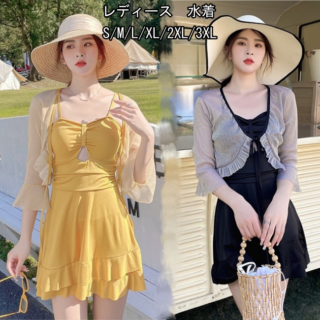 黒 イエローパッド付き 水着 体型カバー ワンピース 黒 ブラック レディース 七分袖2点セットかわいい通販 おしゃれ レディース水着 20代 30代 40代