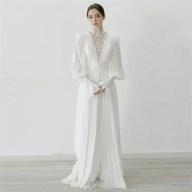 ホワイトウェディングドレス長袖 ロングドレス ウェディングドレス 白パーティードレス二次会ドレスブライダル撮影 2レディースドレス ラインリボンマキシ丈 総レース