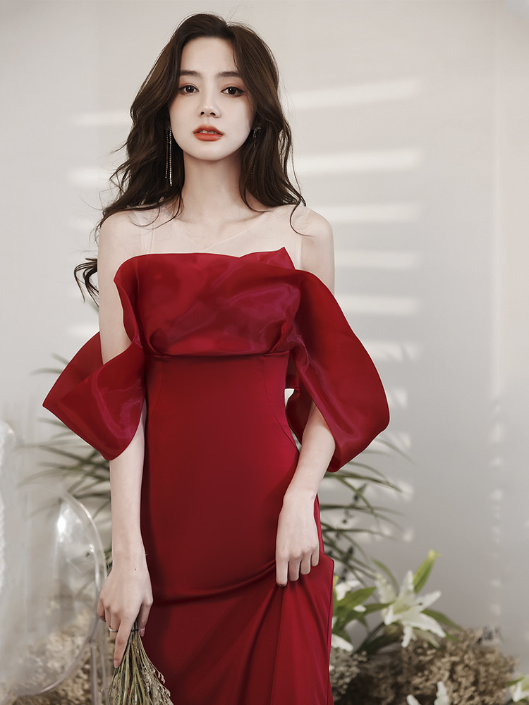 レッド ウェディングドレスAラインオフショルダー ロングドレス ウェディングドレス レース 素地 ファスナータイプs~xxlWedding Dressお花嫁結婚式旅行撮影演出レディースウェディングドレ