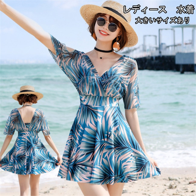 ブルー花柄ワンピース水着 半袖 水着 レディース 女性向け ワンピース ビッグサイズ 半袖 みずぎ 体型カバー カバーアップ 海水浴 オトナ女子 スクール スカート セクシー ママ水 ビーチ 可愛い