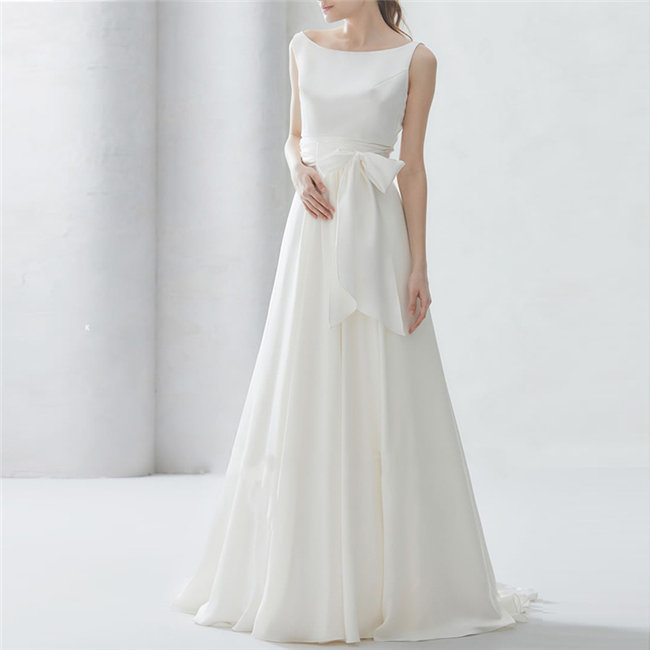 ホワイト ウェディングドレスライン ロングドレス イブニングドレスノースリーブトレーン丸襟 ファスナータイプ~