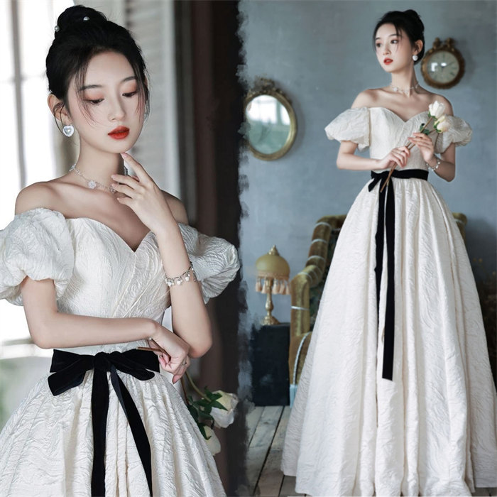 ホワイト ウェディングドレスラインオフショルダー ロングドレス ウェディングドレス 黒リボン付き 素地 編み上げタイプ~3 お花嫁結婚式旅行撮影演出レディースウェディン