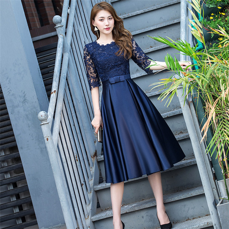 ブラック グレー ネイビー シャンパン二次会ドレス パーティードレスミニドレスフォーマルドレスミニ丈ワンピース二次会演出司会 結婚式お呼ばれ忘年会司会総レース七分袖ショート丈ミモレ丈ミディアムドレス
