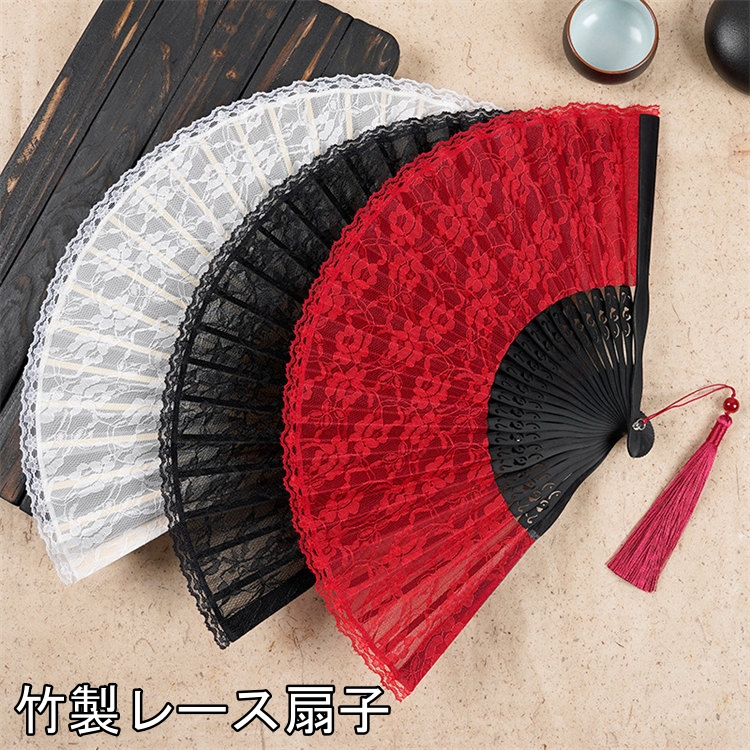 房付き 扇子3色展開女性用婦人用レース扇子竹製 ブラックレース扇子 竹製和風 黒骨 高級感 折りたたみ式 工芸扇子 道具扇子 ダンス扇子 長さ22cm レディース 女性 プレゼント おしゃれ 普段使い