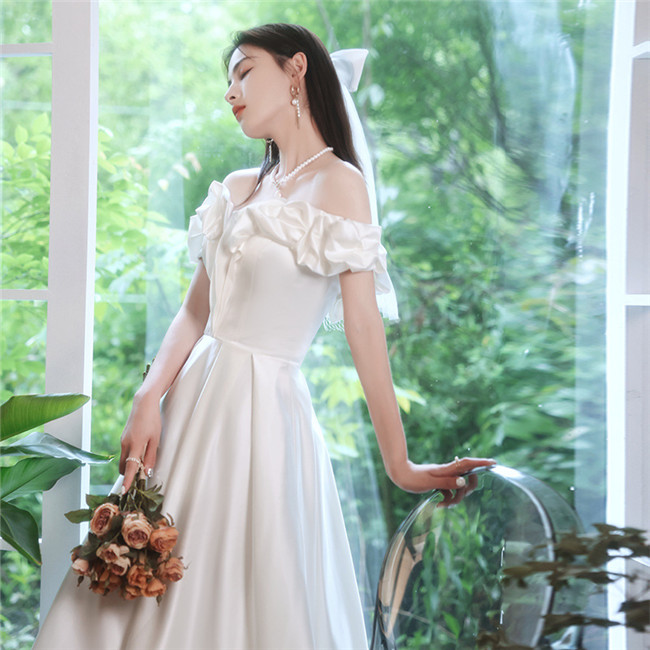 ホワイト オフショルダー ウェディングドレスAラインファスナータイプマキシ丈、ロング丈ロングドレススカート xs~lWedding Dressお花嫁結婚式旅行撮影演出レディースウェディングドレス