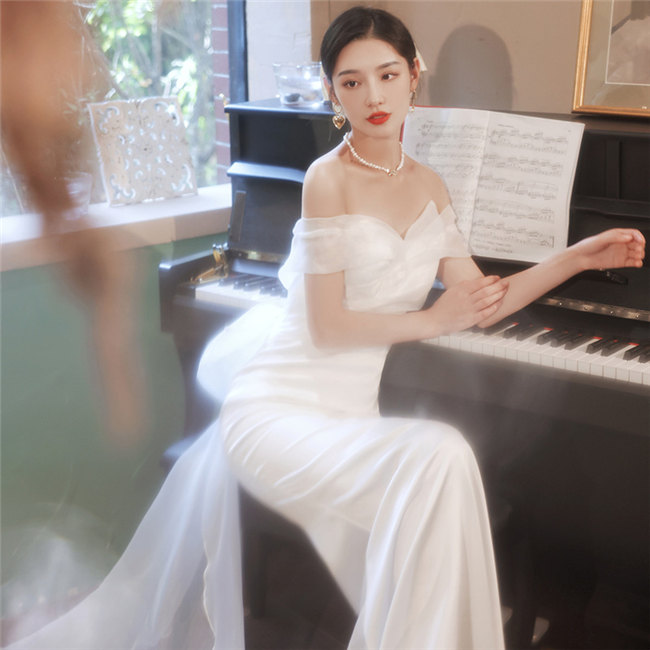 ホワイト ウェディングドレスラインオフショルダー後下がり ロングドレス ウェディングドレス レース 素地 ファスナータイプ~ お花嫁結婚式旅行撮影演出レディースウェ
