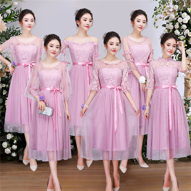 グレー ピンク シャンパン6デザインパーティードレスワンピース二次会演出司会ブライズメイドドレス結婚式お呼ばれ ミモレ丈ミディアムドレスブライズメイドドレスフォーマルドレス花びらミディアム丈特価ドレス