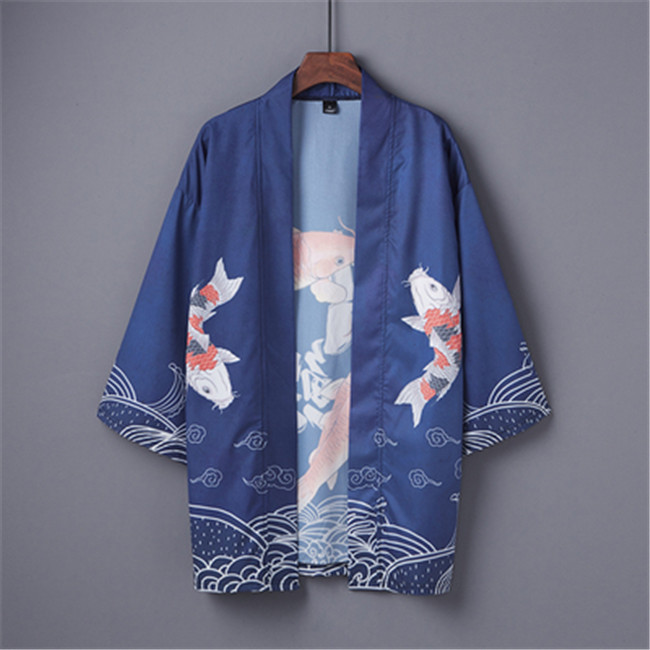 ブルー鯉柄男女兼用 夏祭り 夏恋 寺 法被 羽織り 半纏 はんてん 法被 ハッピ 長半纏 半天 袢天 半被 お祭り衣装 雅 和柄 羽織 和装 ユニセックス 浴衣 着物 はっぴスタイル かっこいい かわ