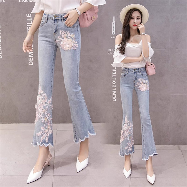 デニムパンツレディースマーメイド ジーンズレース飾りフレアパンツ 超美脚レディースファッション ボトムス パンツ