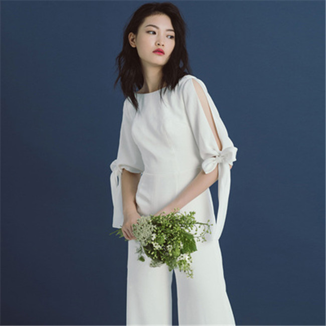 ホワイト ウェディングドレスラインズボンパンツドレス ロングドレス ウェディングドレス レース 素地 ファスナータイプ~ お花嫁結婚式旅行撮影演出レディースウェディング