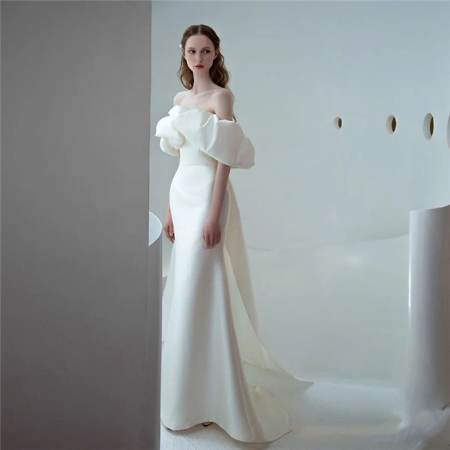 ホワイト オフショルダー ウェディングドレスライン ロングドレス ウェディングドレストレーン レース 素地 ~ お花嫁結婚式旅行撮影演出レディースウェディングドレス