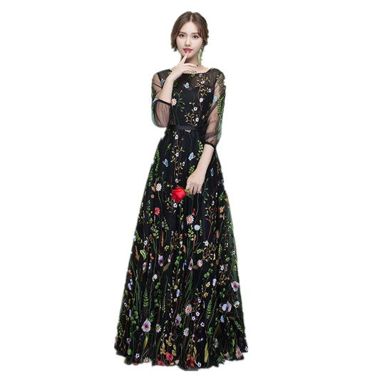 レッド ブラック シャンパン ワインレッド グレー総レース七分袖二次会ドレス パーティードレスミディアム丈フォーマルドレスワンピース二次会演出司会 結婚式お呼ばれ忘年会司会エレガントファスナー