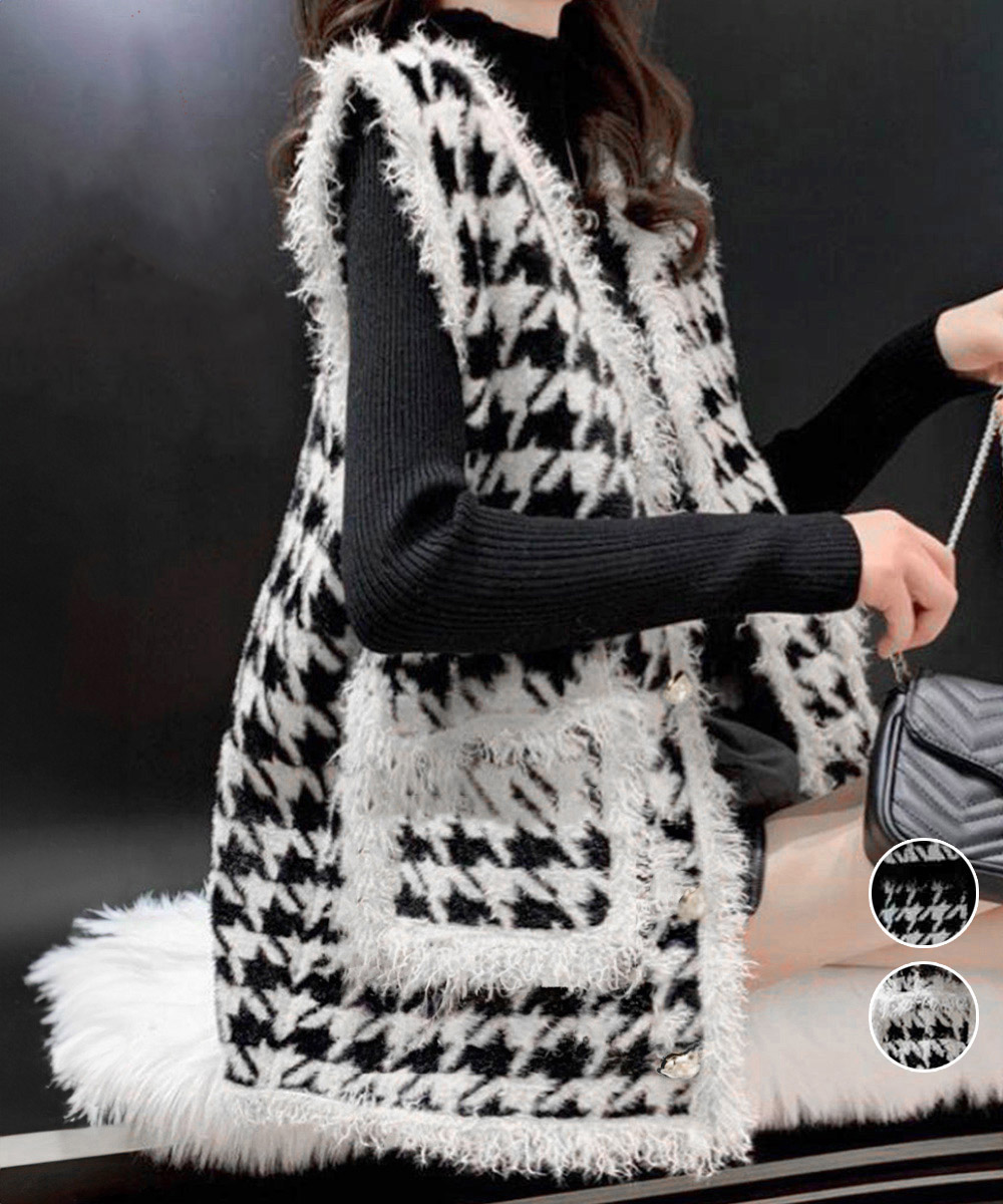 レディース 千鳥格柄 ニットアウター オフィスカジュアル モノトーン 羽織り ノースリーブ ニットカーディガン Vネック