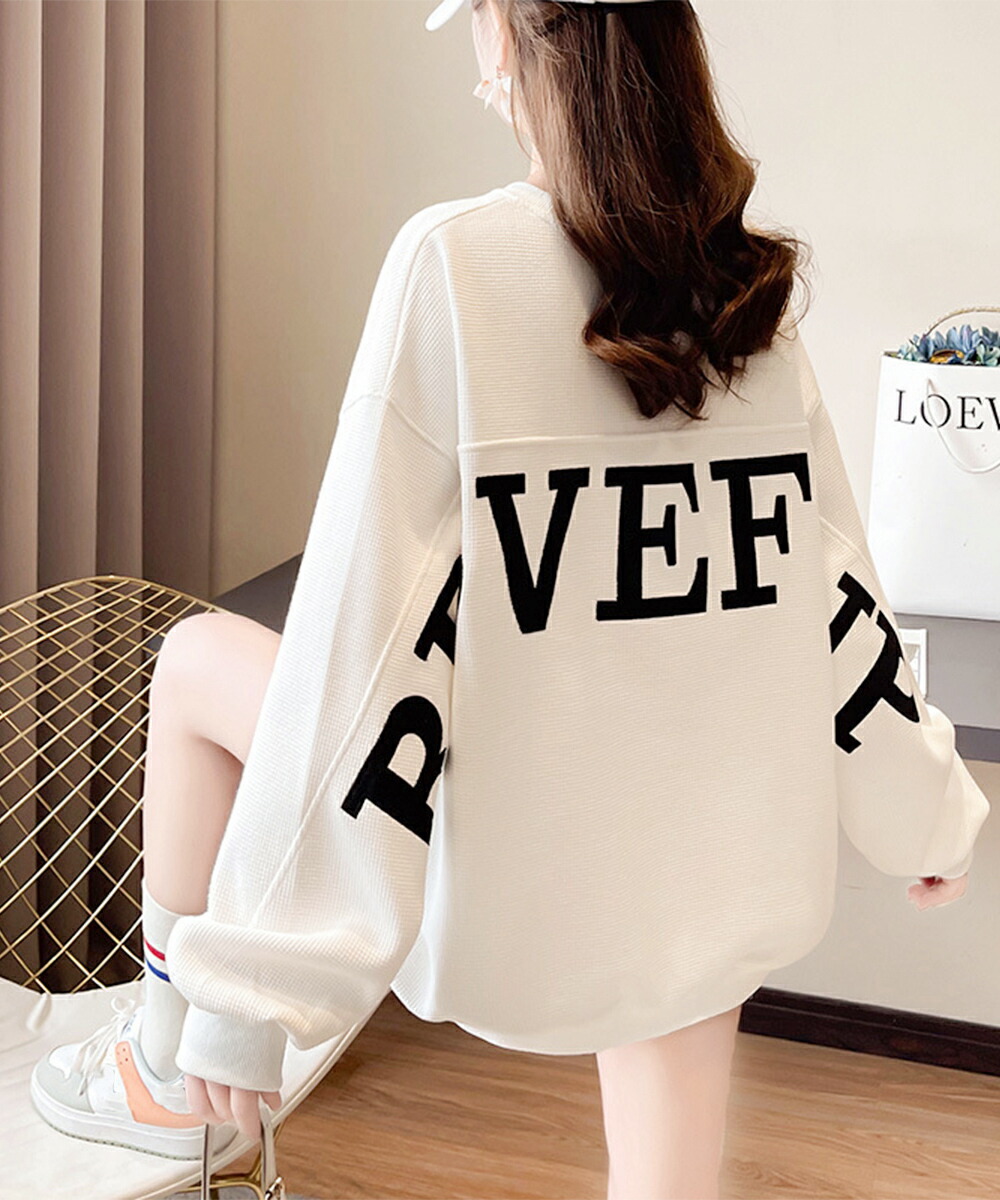 ワッフル編み ロングtシャツ ビッグシルエット バックプリント クルーネック スウェット カジュアル 長袖 ゆるトップス