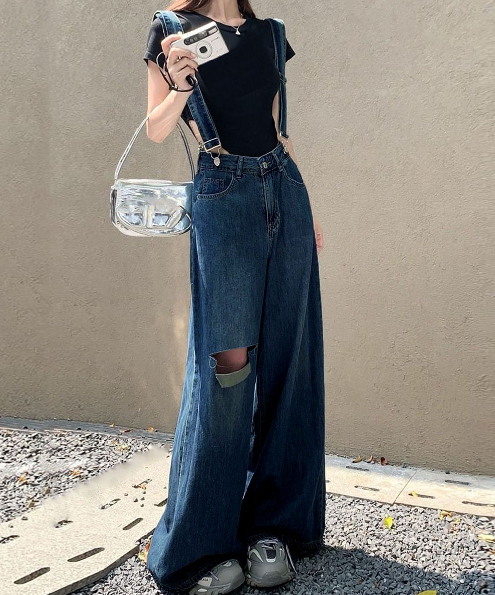 ロングパンツ レディース ストレートパンツ フロントダメージ カジュアル 4サイズ バギーパンツ サスペンダー 脚長