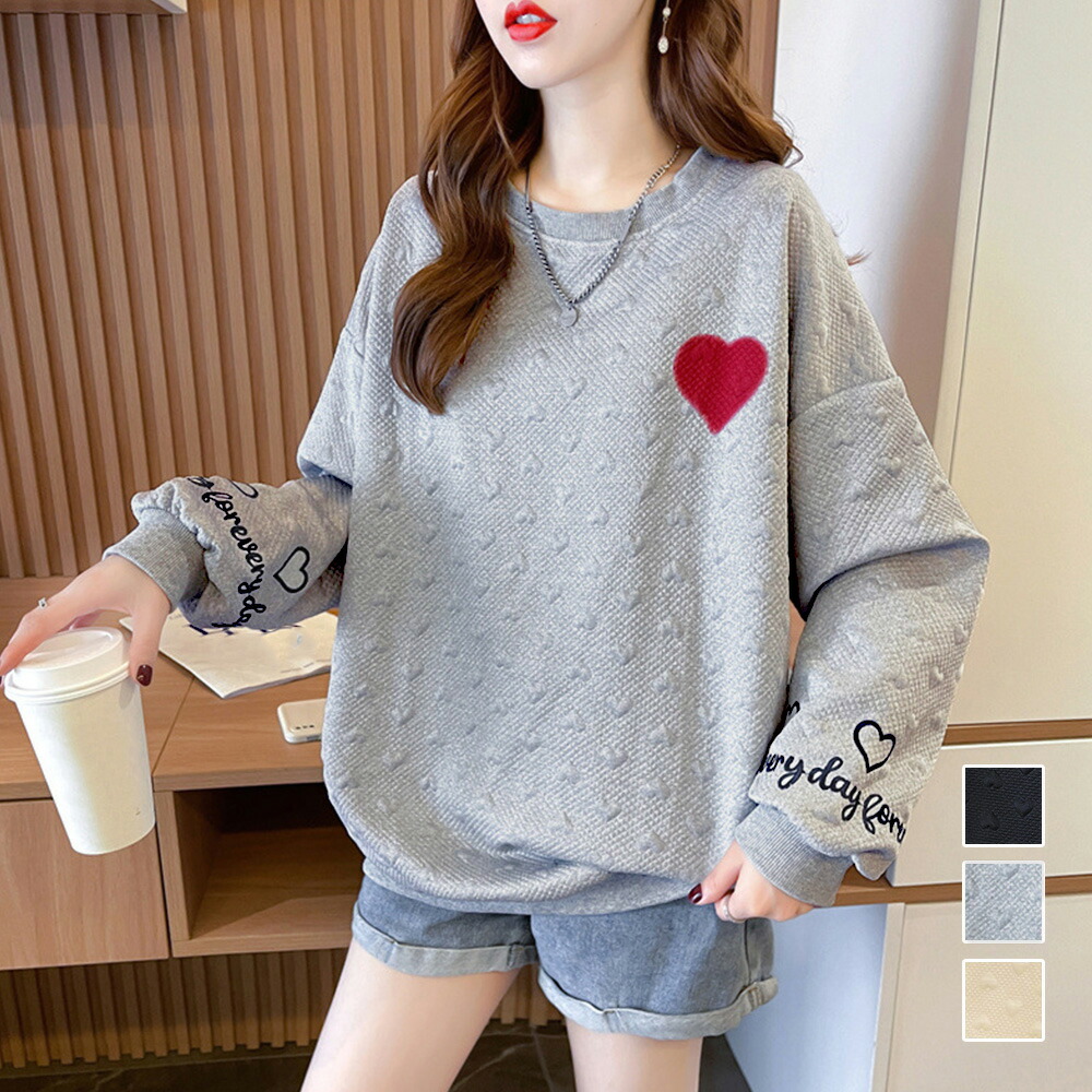カジュアル ラウンドネック ロゴトレーナー エンボス加工 長袖プルオーバー ハート刺しゅう 体型カバー ロン 春秋服