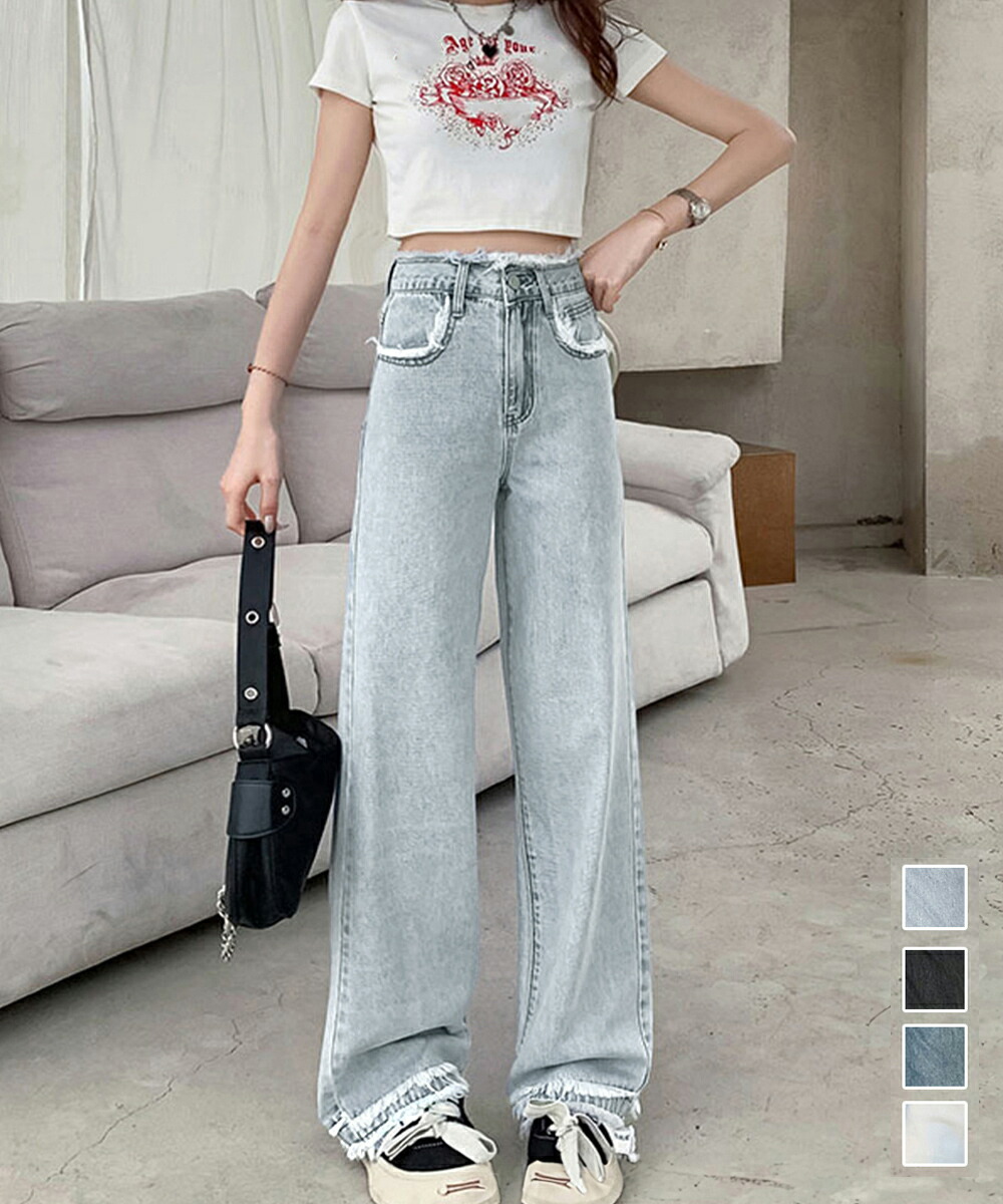 レディース ストレートパンツ ゆったりセミワイドパンツ 韓国風ジーンズ 脚長ロングパンツ 着やせジーパン オールジーンズ