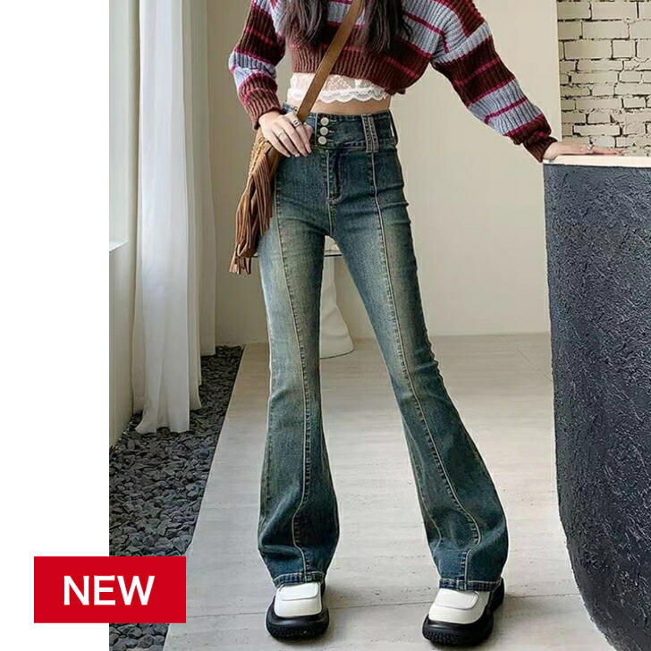 ジーパン ハイウエスト ヴィンテージパンツ 美脚脚長 ブーツカットデニム カジュアル 着やせ フロントラインロングパンツ
