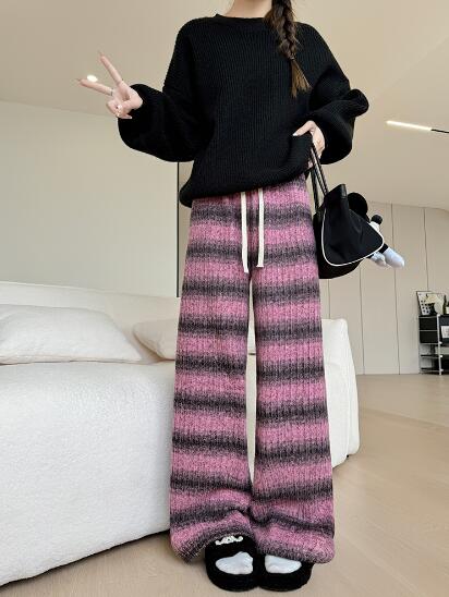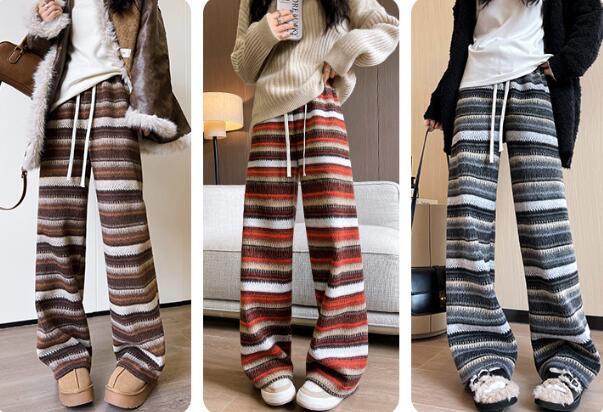 レトロボーダー柄パンツズボンボトムススウェット ロングワイド太い太め大きいサイズビッグジャージゆったりハイウエストポケット動きやすいダンス衣装ヒップホップレディースガールズカジュアル秋冬新品防寒あたた