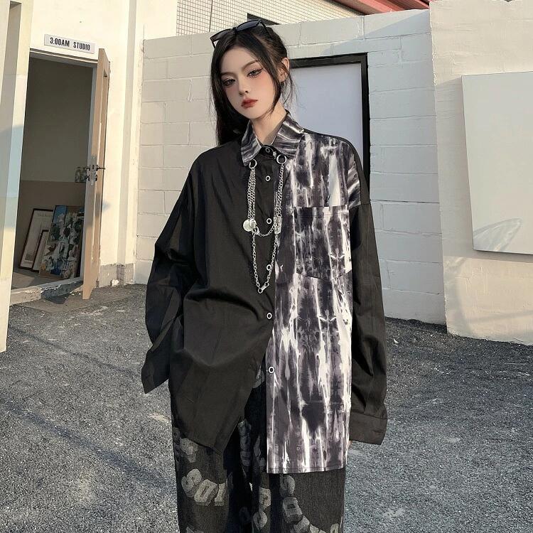 ブラウス シャツ 切り替え バイカラー 配色 ヴィンテージ風 レトロ 体型カバー 原宿系ファッション 韓国 ダンス衣装 HIPHOP 個性的 奇抜 かわいい 青文字系 トップス レディース 長袖 カッ