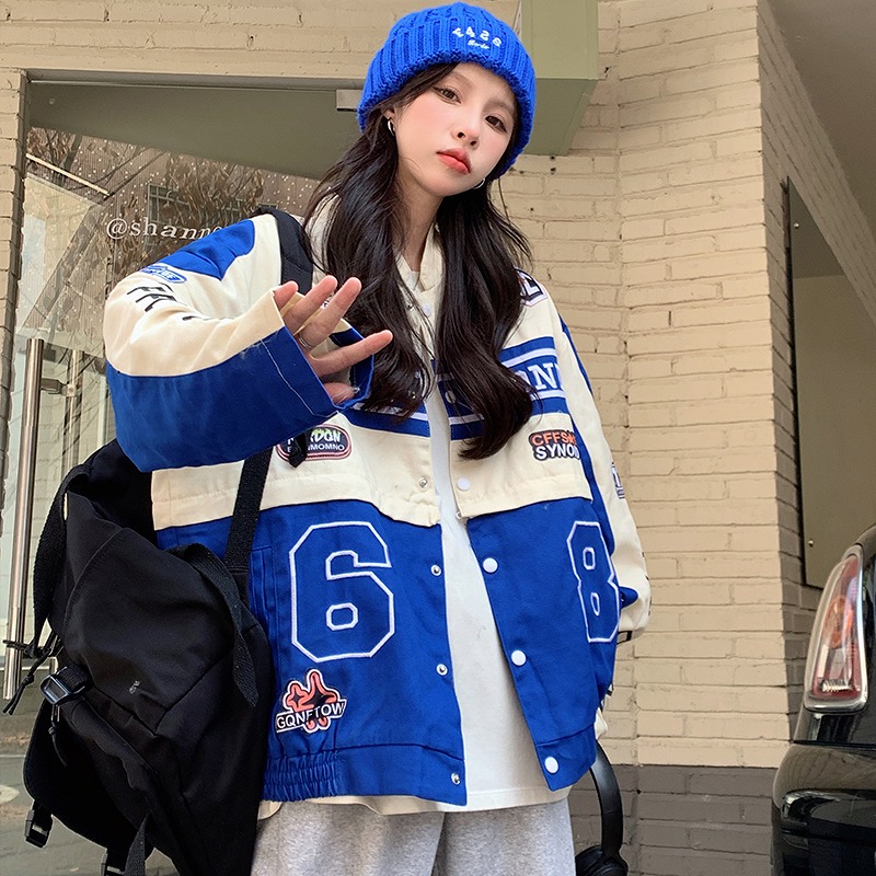 全2色 ジャケット 長袖 切り替え バイカラー 配色 体型カバー 大きいサイズあり ヴィンテージ風 レトロ調 原宿系ファッション 韓国風 ダンス衣装 カワ 個性 奇抜 かわいい 青文字系 アウ