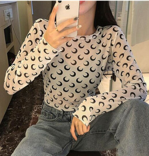月柄3色シースルートップス長袖カットソー薄手透け感シャツインナー重ね着ダンス衣装ヒップホップレディースガールズストリート個性的スター星韓国おしゃれセクシーメロウメロー白黒緑総柄