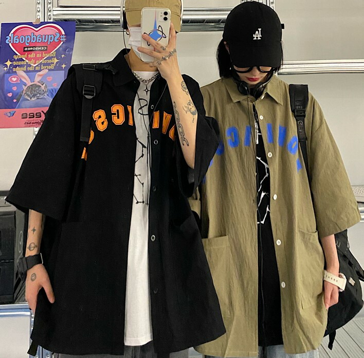 2色ロゴ半袖シャツブラウス前開きボタン大きいサイズビッグゆったりダンス衣装ヒップホップレディースメンズガールズトップスカットソーストリートポケット五分袖カーキ黒ブラックベースボールシャツ韓