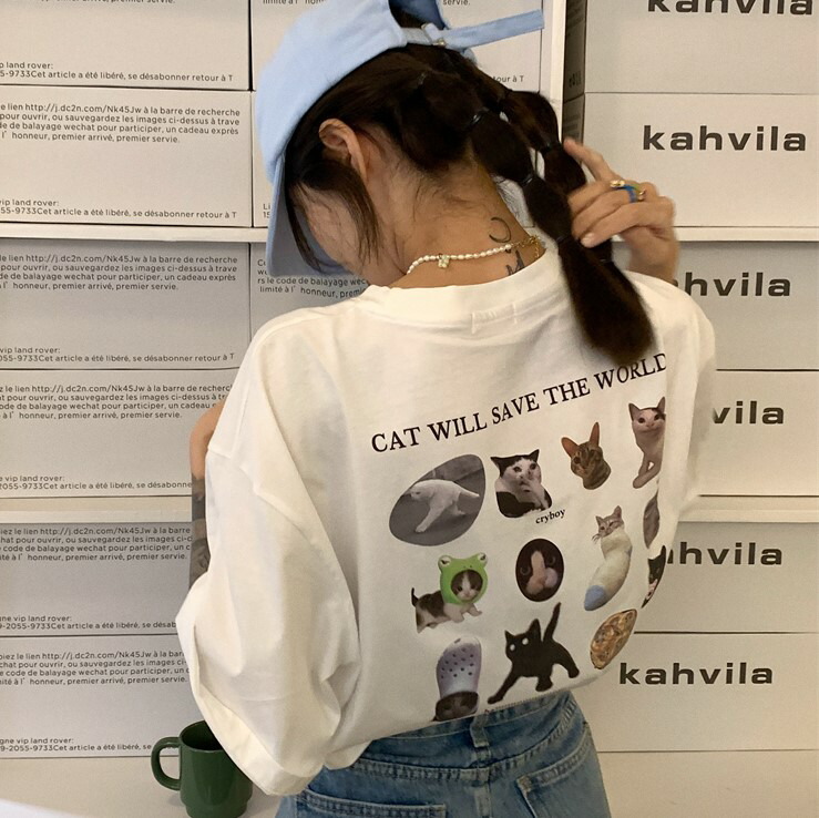猫バックプリントTシャツ半袖トップスカットソーネコねこキャットロゴ白ホワイト大きいサイズビッグアニマル動物ダンス衣装ヒップホップHIPHOPレディースメンズガールズストリート個性的奇抜カラフル可愛い