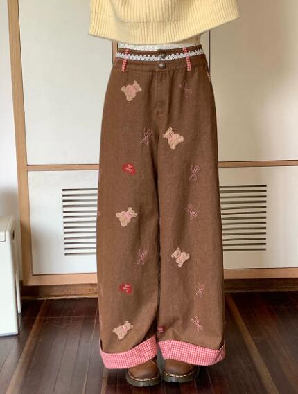 ワッペンクマベアリボンチェック柄切替デニムズボンボトムスパンツジーンズジーパンストレートロングシンプルダンス衣装ヒップホップレディースガールズストリート奇抜派手韓国ビッグ大きいサイズかわい
