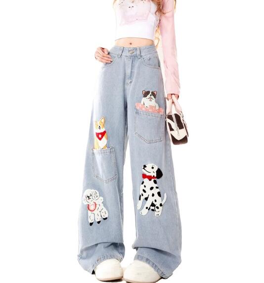 ワッペンデニムズボンボトムスパンツジーンズジーパンストレートロングシンプルダンス衣装ヒップホップレディースガールズストリート奇抜派手韓国ビッグ大きいサイズかわいい