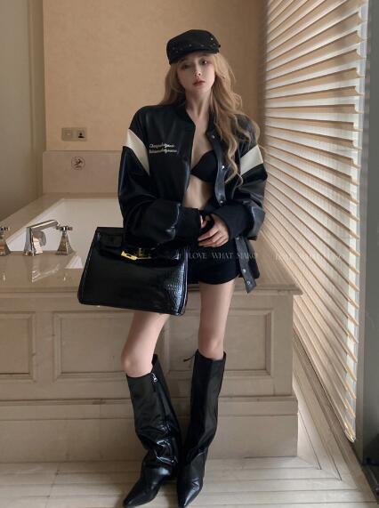 フェイクレザースタジャンベースボールジャケット韓国系ファッション韓国ジャケットブルゾンジャンパーレディースダンス衣装ダンス発表会文化祭イベント個性的奇抜ストリートアウター