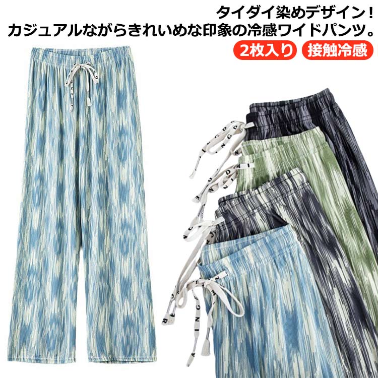 カジュアル レディース 冷感パンツ ワイドパンツ タイダイ染め イージーパンツ 接触冷感 パンツ 春服 夏服 総柄 きれいめ 2枚セット