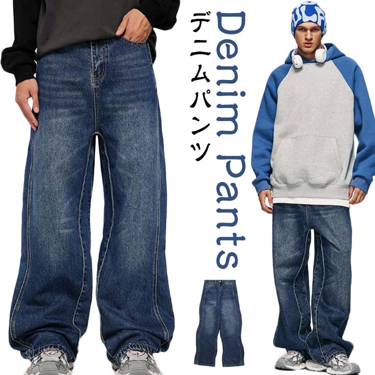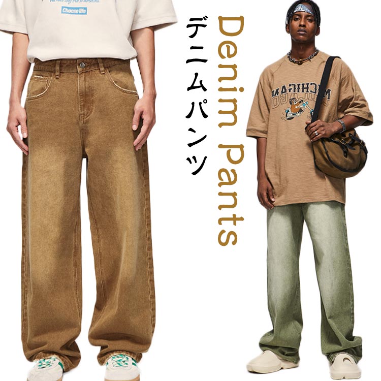 デニム ウォッシュ加工 ワイド ジーンズ デニムパンツ ロング ワイドパンツ パンツ ストレート 春 デニムパンツ メンズ ジーンズ デニム デニム ゆったり イージーパンツ リラックス パンツ スト